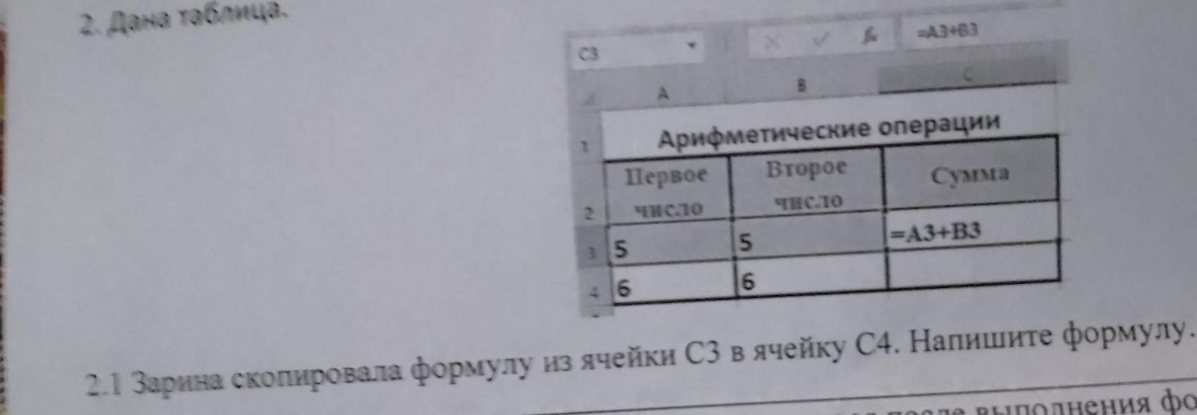ПОМОГИТЕ ПОЖАЛУЙСТА ДАЮ 20 БАЛЛОВ. зарина скопировала формулу из ячейки C3 в ячейку C4. Напишите формулу. ТАБЛИЦА НА ФОТО