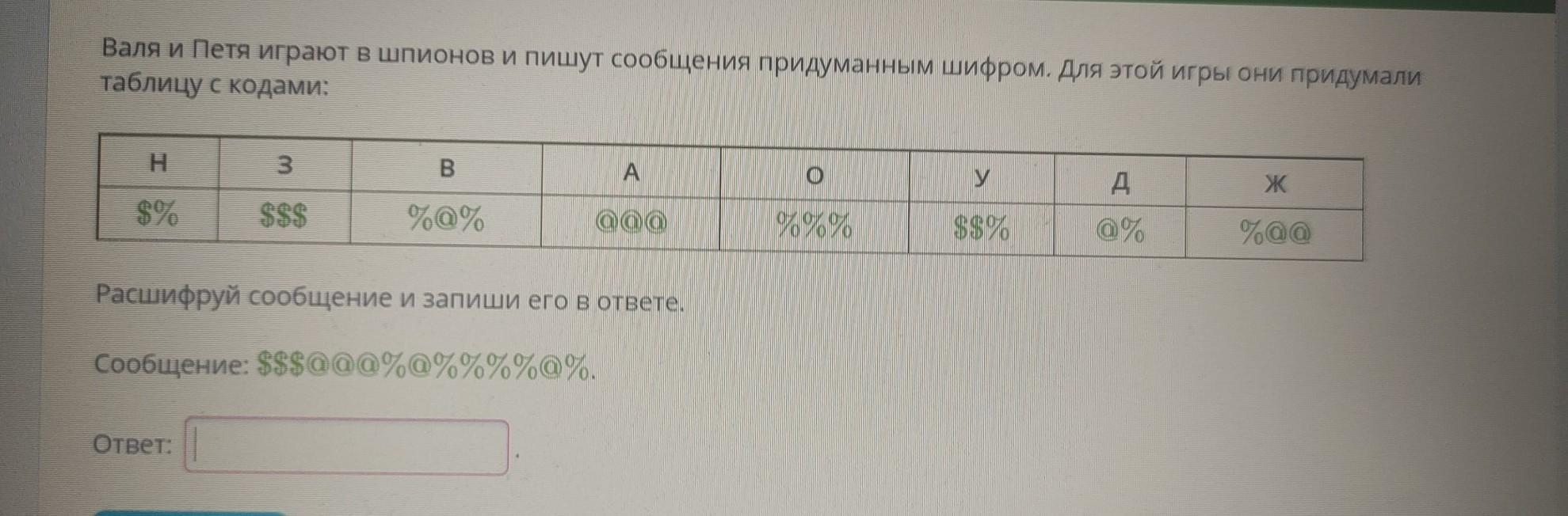 Валя и Петя играют в шпионов и пишут сообщения придуманным шифром. Для этой игры они придумали таблицу с кодами: Н $% 3 $$$ В %@% A 200 Расшифруй сообщение и запиши его в ответе. Сообщение: $$$@@@%@%%%%%%. %%% У $$% Д @% Ж %@@