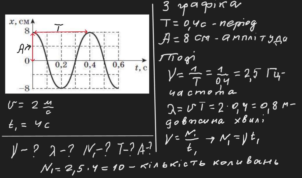 На рисунку показано графік коливань поплавка на поверхні річки. Визначте значення величин, якщо відповіді одержані в СІ