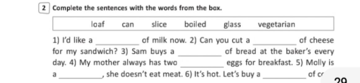 1) glass .2)slice .3)loaf .4)boiled.5)vegetarian .6)can