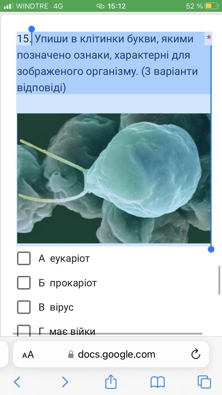 Упиши в клітинки букви, якими позначено ознаки, характерні для зображеного організму. (3 варіанти відповіді)