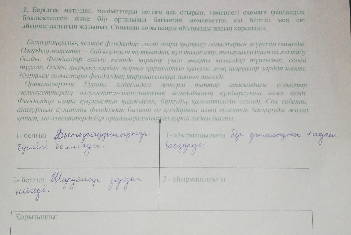 1. Берілген мәтіндегі мәліметтердi негізге ала отырып, темендегі схемага феодалдык белшектенген және бір орталыққа бағынған мемлекеттiн екi белгici мен айырмашылыгын жазыныз. Сонынан корытынды ойынызды жазып көрсетiнiз. Бытыраңқылық кезінде феодалдар унеми взара қырқысу созыстарын жүргізі отырды. Олардың мақсаты бай кориисін тұтқындап, кун талап ету, тонаушылыкпен олжа табу болды. Феодалдар соғыс кезінде қорғану ушін мықты қамалдар тұрғызып, сонда турган. Өзара қырқысулардан әсіресе қорғанатын қамалы жоқ шаруалар зардап шект. Қырқысу соғыстары феодалдық шаруашылыққа зиянын тигізді. Ортазасырлық Еуропа елдеріндегі Эртурм manmap арасындагы соғыстар мемлекеттердің әлеуметтік-экономикалық жағдайынын кулдырауына алып келді. Феодалдар озара қырқыстан қалжырап, бірігудің қажеттілігін сезиді. Сол себепті, анасурлым ауқатты феодалдар билікті оз қолдарына алып аулеттік басқаруды жолга қойып, мемлекеттерді бір орталықтандыруза қарай қадам басты. 1- белгiсi 1- айырмашылығы 2- белгiсi Қорытынды: 2 - айырмашылығы