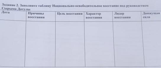 Задание 2. Заполните таблицу Сырыма Датулы Дати Причины восстания Национально-освободительное восстание под руководст Цель восстания Характер Лидер восстания восстания