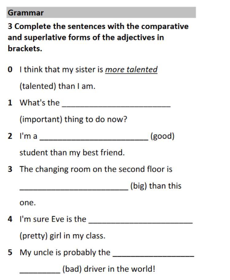 1. More important 2. Well 3. Bigger 4. Prettiest.