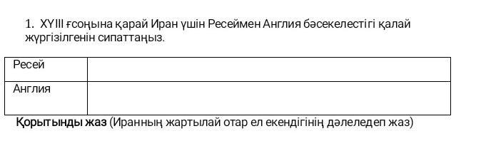 1. ХҮІІІ ғсоңына қарай Иран үшін Ресеймен Англия бәсекелестiгi қалай жүргiзiлгенiн сипаттаңыз. Ресей Англия Қорытынды жаз (Иранның жартылай отар ел екендiгiнiң дәлеледеп жаз) пж на 40 баллов