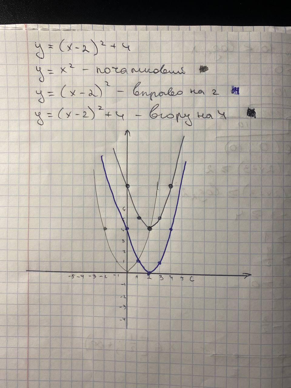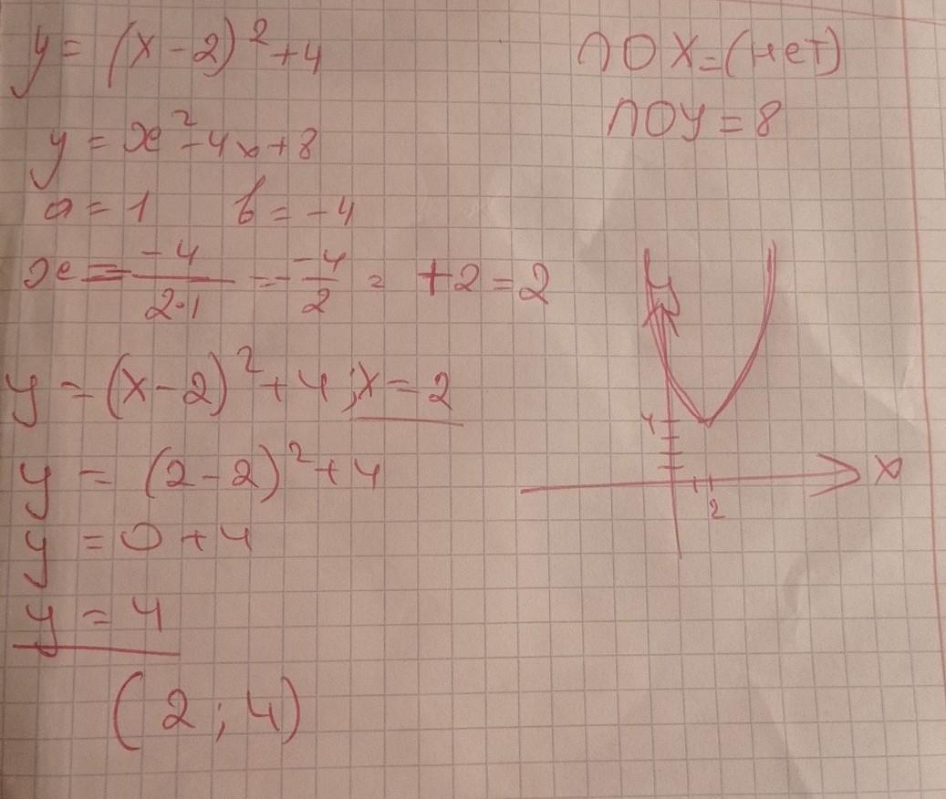 y=(x-2)^2+4 постройте график функции (с полним объяснением и желательно начертить в тетради)