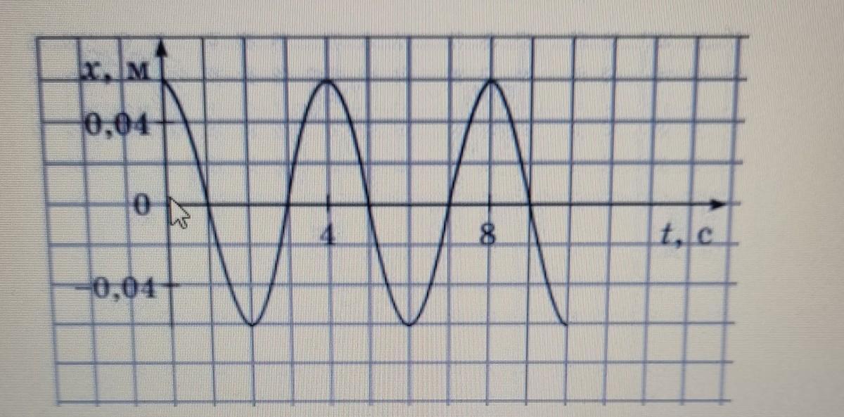 Срочно пожалуйста!! На рисунку наведено графік залежності зміщення частинки у хвилі від часу. Визнач частоту коливань частинок у хвилі та довжину хвилі, яка поширюється зі швидкістю 80 см/с. kx.M 0,04 0 0,04 П 8 t,ic