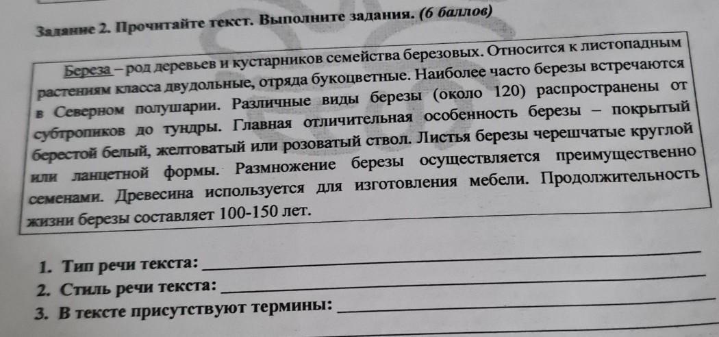Задание 2. Прочитайте текст. Выполните задания. (6 баллов)1. Тип речи текста: 2. Стиль речи текста: 3. В тексте присутствуют термины: