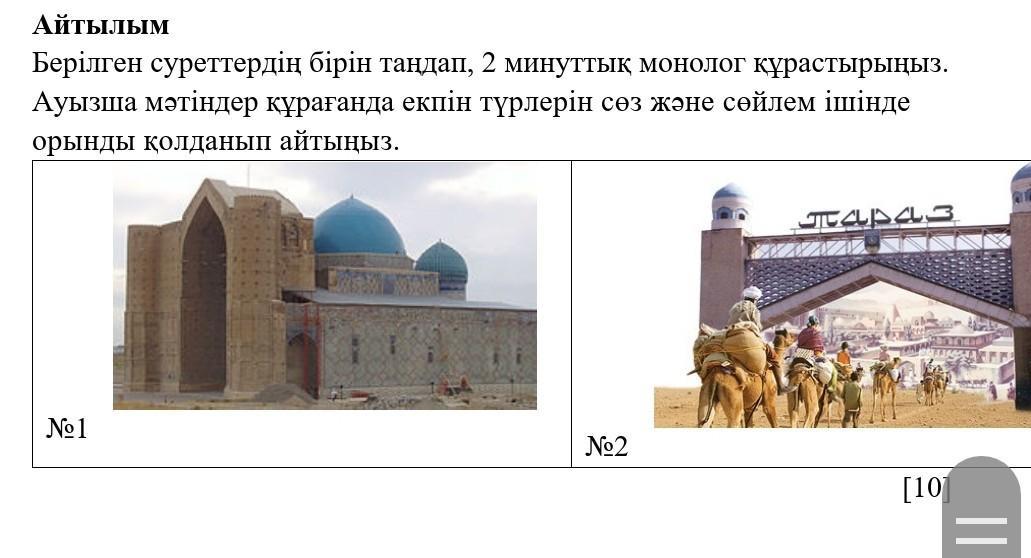 Айтылым Берілген суреттердің бірін таңдап, 2 минуттық монолог құрастырыңыз. Ауызша мәтіндер құрағанда екпін түрлерін сөз және сөйлем ішінде орынды қолданып айтыңыз.