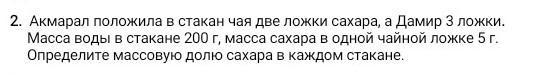 2. Акмарал положила в стакан чая две ложки сахара, а Дамир 3 ложки. Масса воды в стакане 200 г, масса сахара в одной чайной ложке 5 г. Определите массовую долю сахара в каждом стакане.