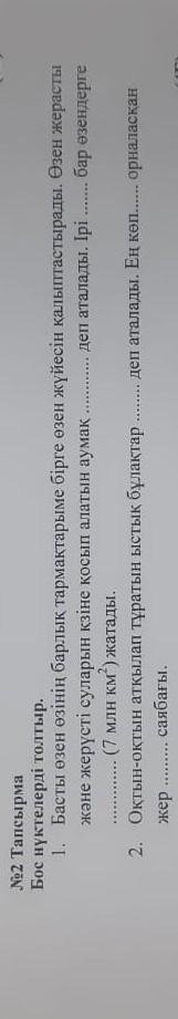 №2 Тапсырма Бос нүктелердi толтыр. 1. Басты өзен өзiнiн барлык тармактарыме бiрге өзен жүйесiн калыптастырады. Өзен жерасты және жерүсті суларын кзiне косып алатын аумак деп аталады. Iрi ....... бар өзендерге (7 млн км²) жатады. деп аталады. Ең көп.. орналаскан 2. Оқтын-оқтын аткылап тұратын ыстык булактар саябағы. ********* жер ..... ********** памагите пж дам 100 б