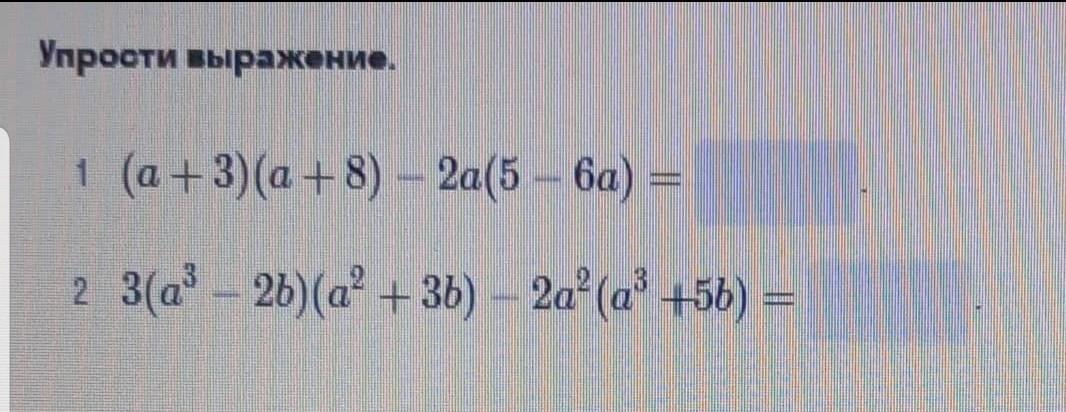 Упрости выражение. 1 (a+3)(a +8) - 2a(5 - 6a) = ----- 2 3(a³ - 2b) (a² + 3b) — 2a² (a³ +5b) =