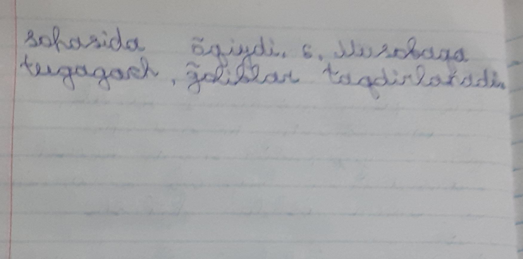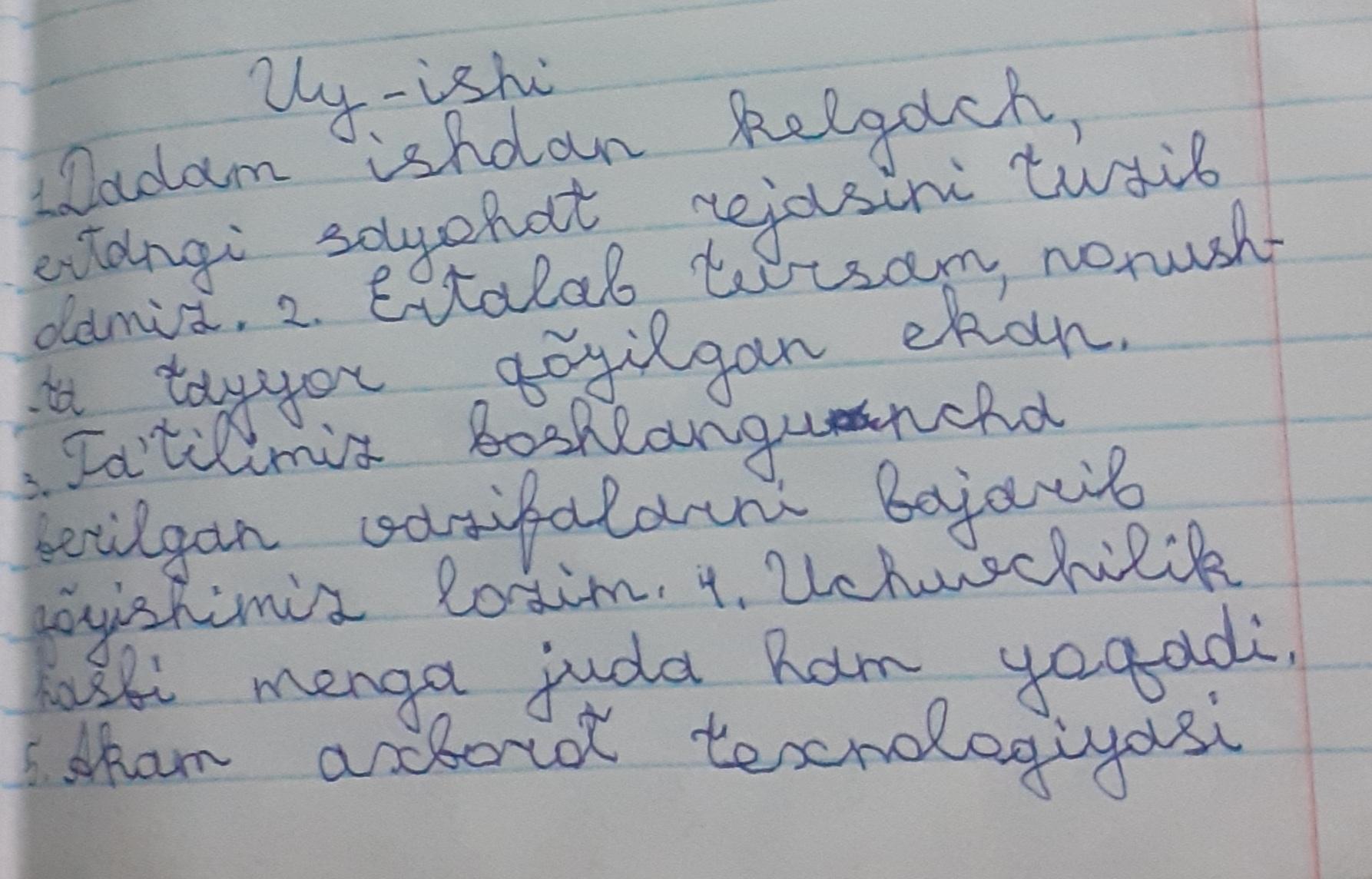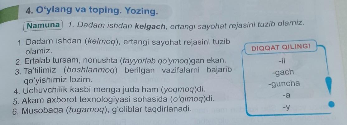 4. O'ylang va toping. Yozing. Namuna 1. Dadam ishdan kelgach, ertangi sayohat rejasini tuzib olar 1. Dadam ishdan (kelmoq), ertangi sayohat rejasini tuzib olamiz. 2. Ertalab tursam, nonushta (tayyorlab qo'ymoq)gan ekan. 3. Ta'tilimiz (boshlanmoq) berilgan vazifalarni bajarib qo'yishimiz lozim. 4. Uchuvchilik kasbi menga juda ham (yoqmoq)di. 5. Akam axborot texnologiyasi sohasida (o'qimoq)di. 6. Musobaqa (tugamoq), g'oliblar taqdirlanadi.