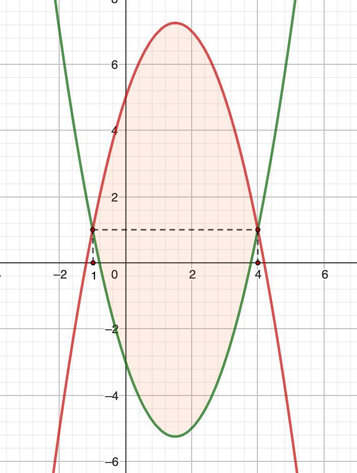 a = -1; b = 4; f₂(x) = y = 3x + 5 - х²; f₁(x) = x² - 3x - 3