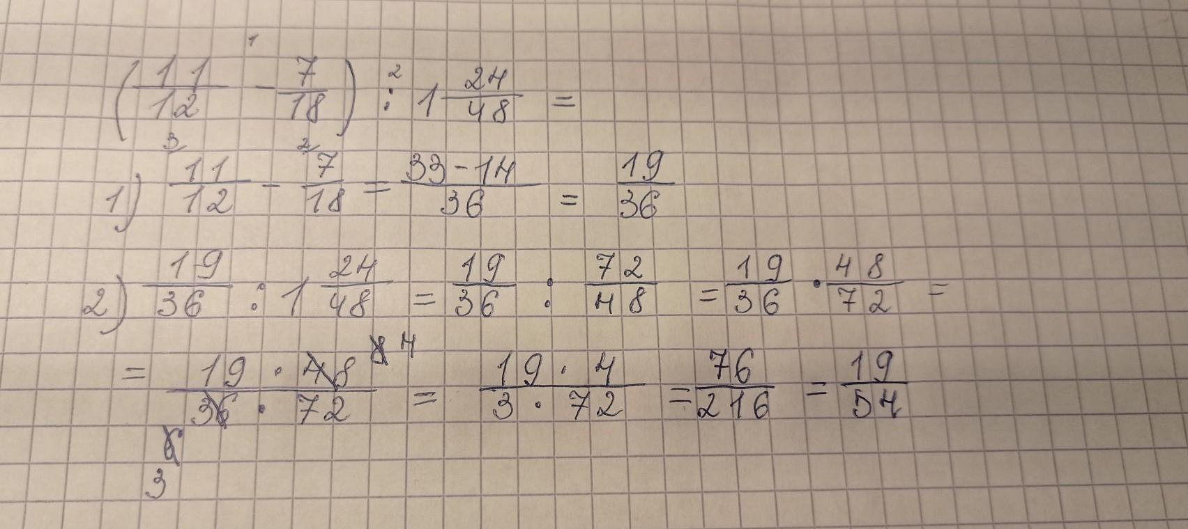(11/12-7/18) : 1 24/48 = (33/36-14/36) : 72/48 = 19/36 : 72/48 = 19/36 * 48/72 = 19/54