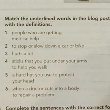 1. Patient, 2. traffic cop, 3. pain, 4.crutches, 5. helmet, 6. surgery