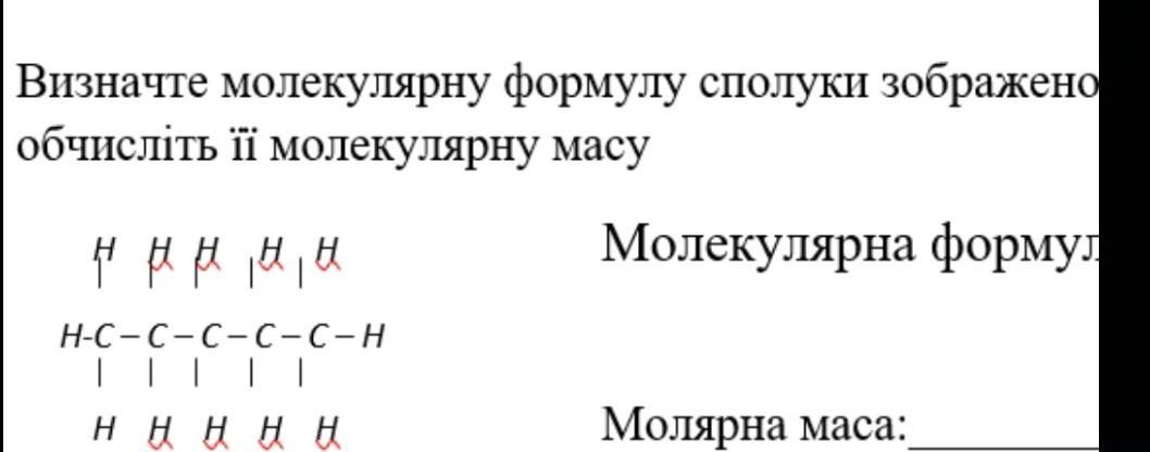 Визначте молекулярну формулу сполуки зображено обчисліть її молекулярну масу Молекулярна формул наа, а, а Н-С-С-С-С-С-Н ||||| ныыыы Молярна маса: