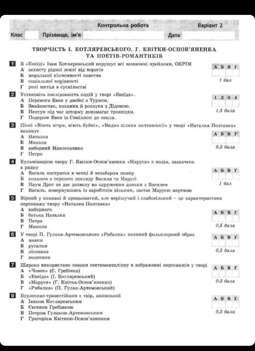 творчість І. Котляревського , Г Квітки- Основ'яненка та поетів - романтиків