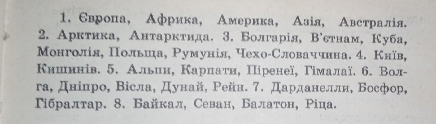1. Материки. 2. Полюси. 3. Країни. 4. Столиці. 5. Гори. 6. Річки. 7. Протоки. 8. Озера.