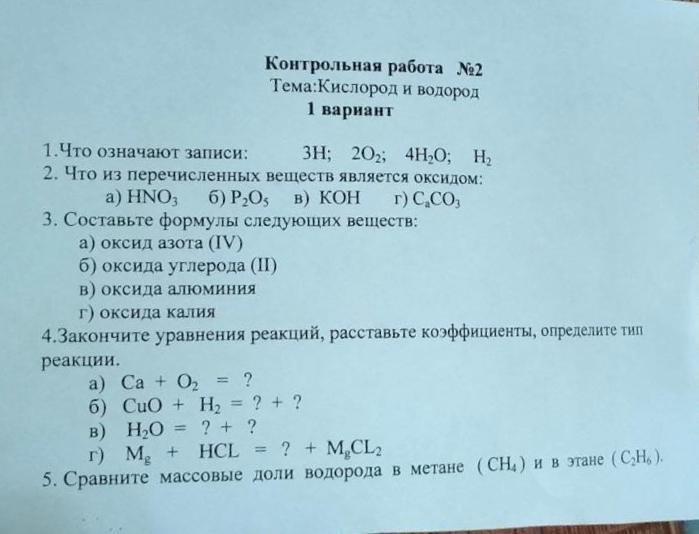 помогите решите контрольную работу по химии, пожалуйста!! тема «Водород, Кислород» 8 класс, дам 50 балов