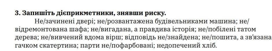 Незачинені двері ; не розвантажена будівельниками машина ; невідремонтована шафа ; не вигадана , а правдива історія ; не побілені татом дерева ; не вивчений вдома вірш ; відповідь не знайдена ; не пошита , а зв'язанв гачком скатертина ; парти не пофарбовані; недопечений хліб.