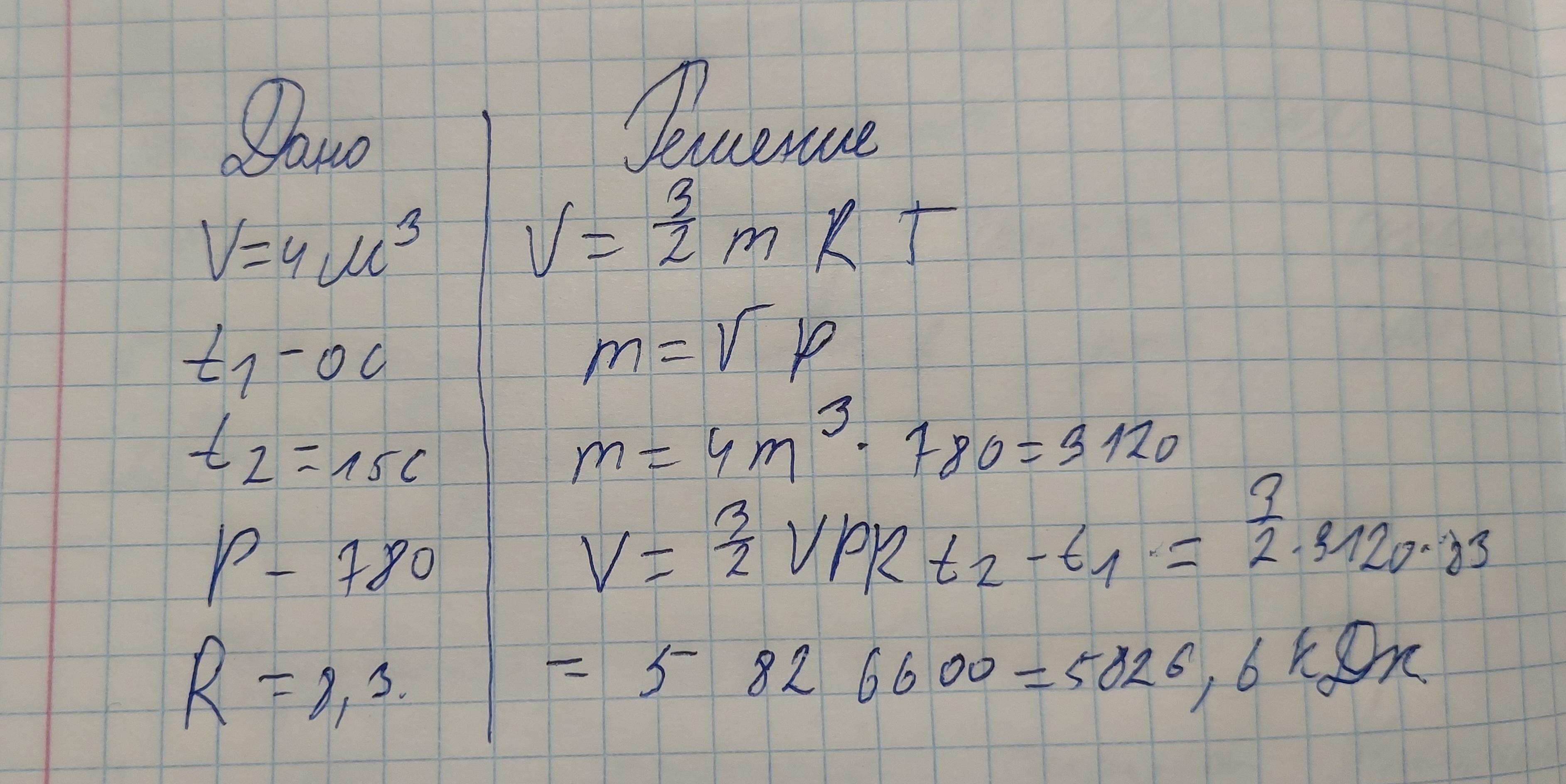 Резервуар объемом 4 м3 заполненный бензином,вследствие солнечного излучения нагрелась от 0 до 15 С. На сколько изменилась внутренняя энергия бензина?