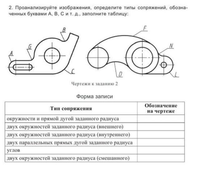 2. Проанализируйте изображения, определите типы сопряжений, обозна- ченных буквами А, В, С и т. д., заполните таблицу: C Чертежи к заданию 2 Форма записи D Тип сопряжения окружности и прямой дугой заданного радиуса двух окружностей заданного радиуса (внешнего) двух окружностей заданного радиуса (внутреннего) двух параллельных прямых дугой заданного радиуса углов двух окружностей заданного радиуса (смешанного) N Обозначение на чертеже