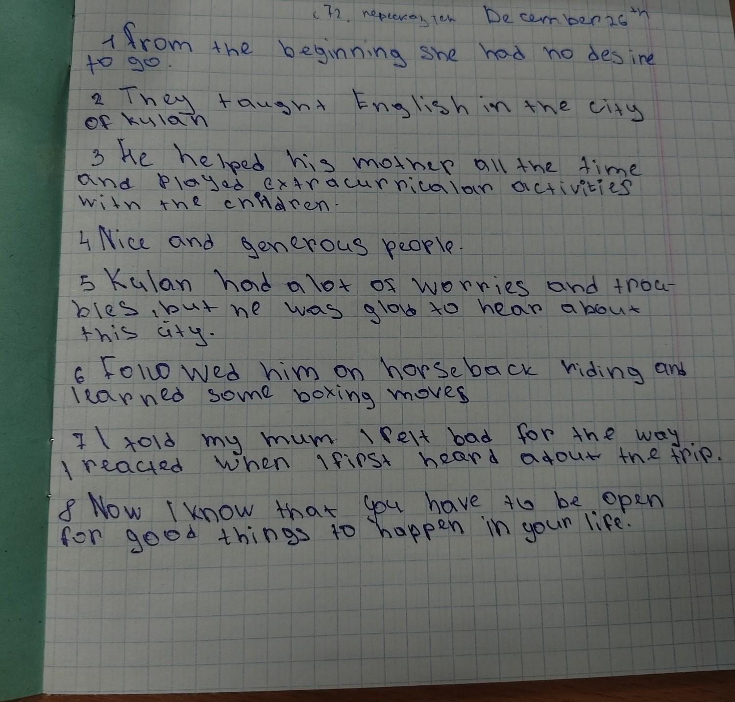2 Read the article again. Answer the questions. 1 What was Andy's first reaction to volunteering in Kazakhstan? What tasks did Andy have as a volunteer? 2 4 3 Who tried to cheer up Andy and how? How does Andy describe the locals in Kulan? 5 Why didn't Andy feel homesick in Kulan? 6 What skills did Andy learn while he was in Kulan? 7 How did Andy feel towards his mum after the experience? 8 What lesson did Andy learn about life after this experience?