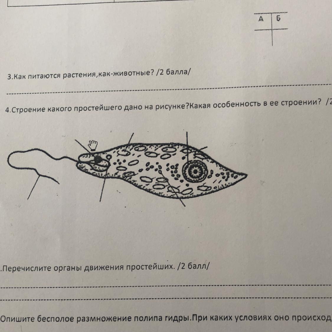 4.Строение какого простейшего дано на рисунке?Какая особенность в ее строении? /2 балл/