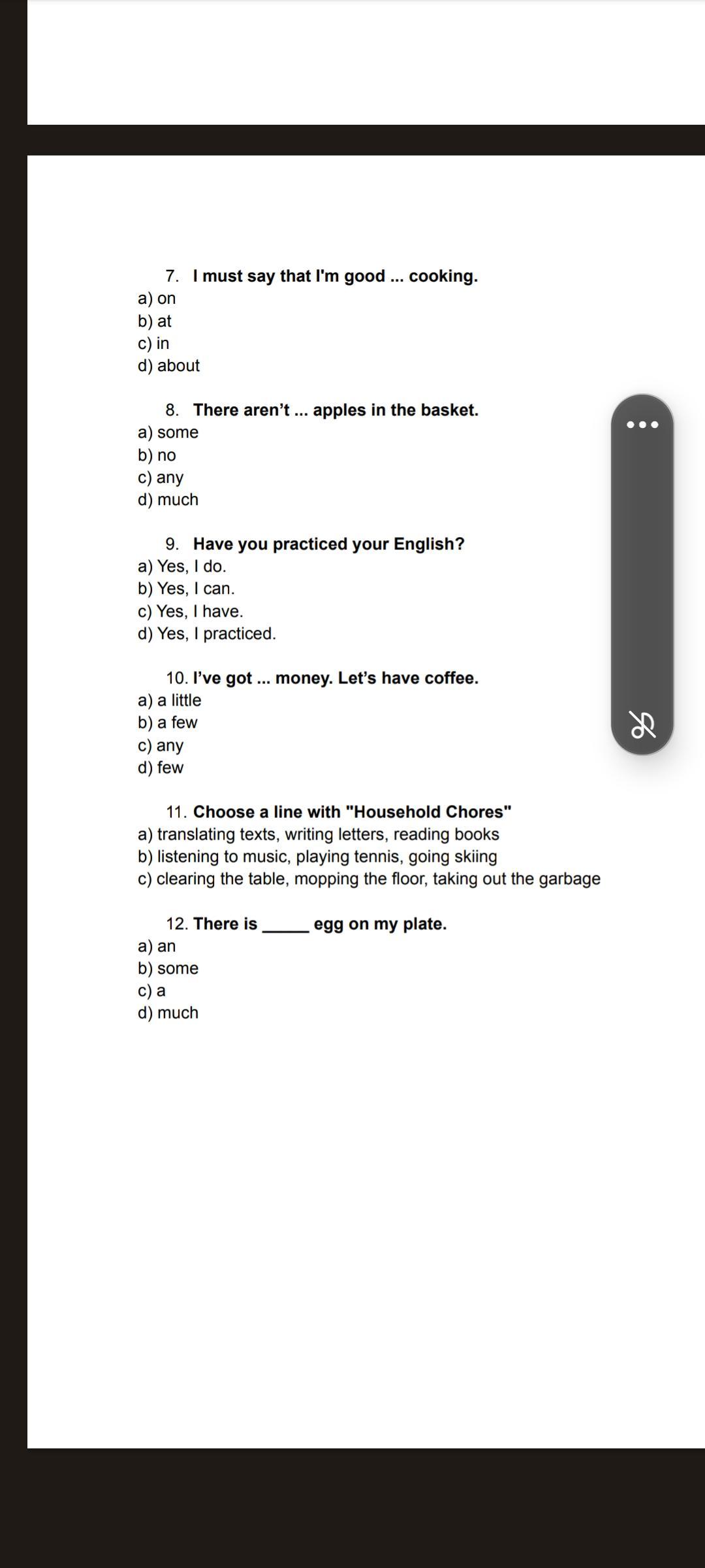 Объяснение: 1 - a, 2 - d, 3 - a, 4 - b, 5 - a, 6 - c, 7 - b, 8 - ?d?, 9 - c, 10 - a, 11 - c, 12 - a