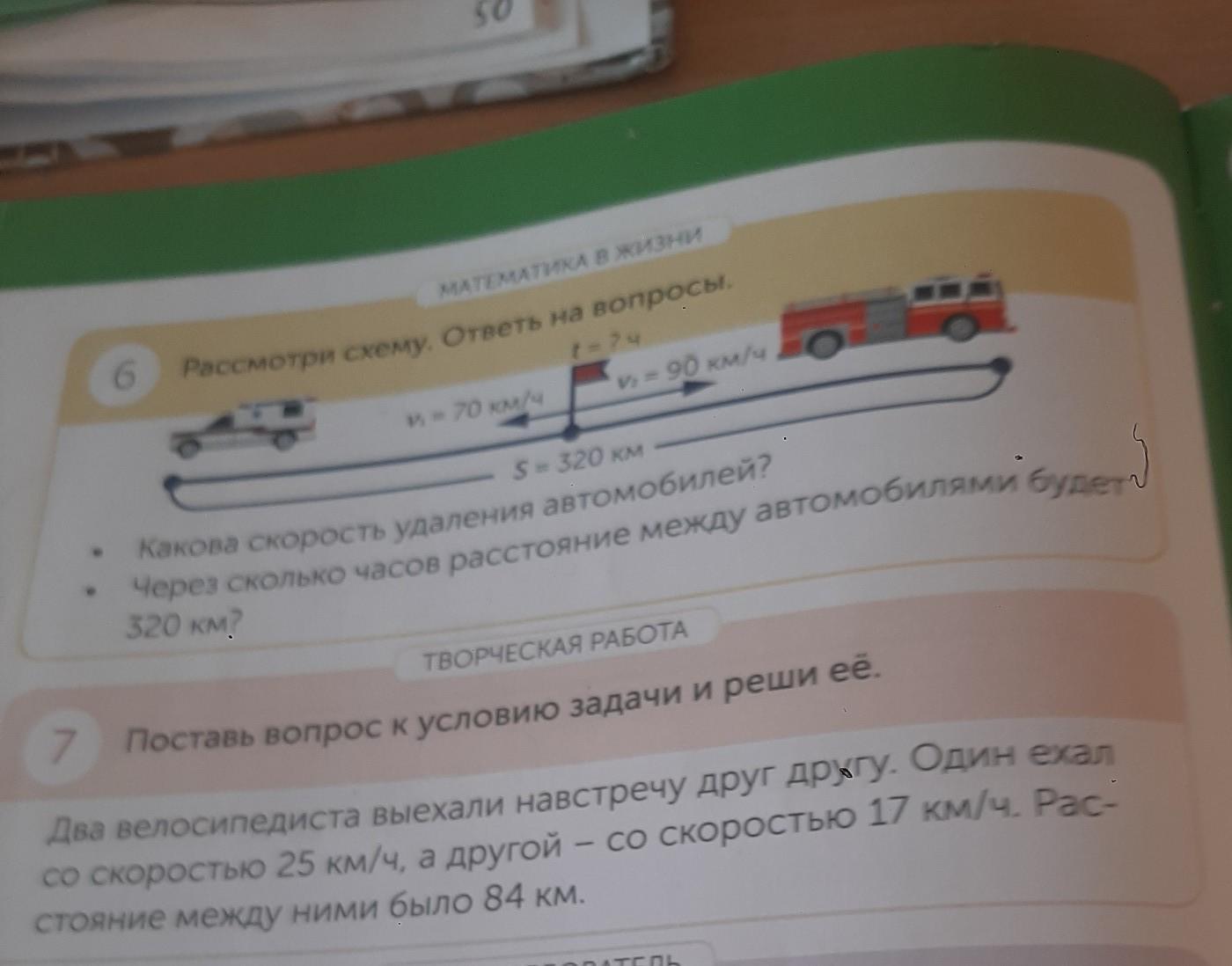 ТВОРЧЕСКАЯ РАБОТА Поставь вопрос к условию задачи и реши её. 7 Два велосипедиста выехали навстречу друг другу. Один ехал со скоростью 25 км/ч, а другой – со скоростью 17 км/ч. Рас- стояние между ними было 84 км. отель подайлуста по фото