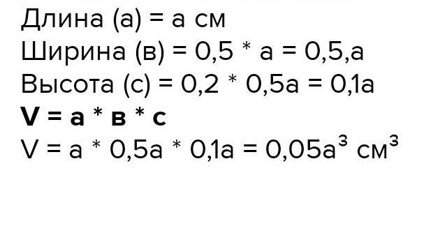 4.Составьте выражение по условию задачи. Дина коробки а см, ширина составляет 0,5 длины, а высота 20% ширины. Найдите объем коробки.