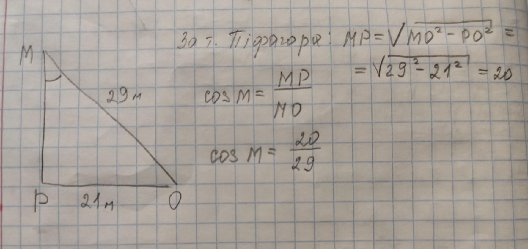 Вычислите косинус острого угла М прямоугольного треугольника,у которого катет PO равен 21м,а гипотенуза равна 29м