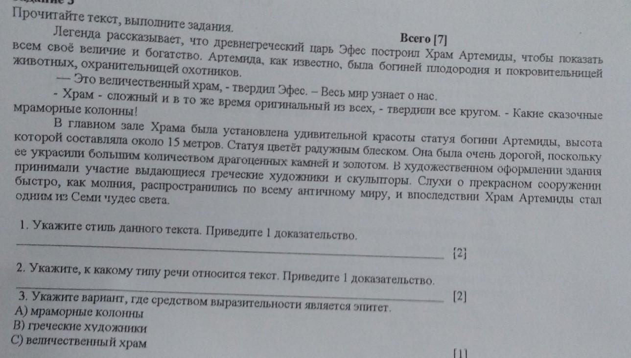 Задание 3 Прочитайте текст, выполните задания. Всего [7] Легенда рассказывает, что древнегреческий царь Эфес построил Храм Артемиды, чтобы показать всем своё величие и богатство. Артемида, как известно, была богиней плодородия и покровительницей животных, охранительницей охотников. Это величественный храм, - твердил Эфес. - Весь мир узнает о нас. Храм - сложный и в то же время оригинальный из всех, - твердили все кругом. - Какие сказочные мраморные колонны! В главном зале Храма была установлена удивительной красоты статуя богини Артемиды, высота которой составляла около 15 метров. Статуя цветёт радужным блеском. Она была очень дорогой, поскольку ее украсили большим количеством драгоценных камней и золотом. В художественном оформлении здания принимали участие выдающиеся греческие художники и скульпторы. Слухи о прекрасном сооружении быстро, как молния, распространились по всему античному миру, и впоследствии Храм Артемиды стал одним из Семи чудес света. 1. Укажите стиль данного текста. Приведите 1 доказательство. 2. Укажите, к какому типу речи относится текст. Приведите 1 доказательство. 3. Укажите вариант, где средством выразительности является эпитет. А) мраморные колонны В) греческие художники С) величественный храм [2] [2]