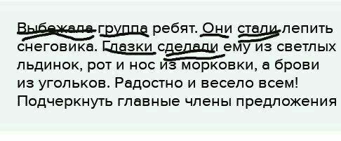 Выбежала группа ребят. Они стали лепить снеговика. Глазки сделали ему из светлых льдинок, рот и нос из морковки, а брови из угольков. Радостно и весело всем! Подчеркнуть главные члены предложения