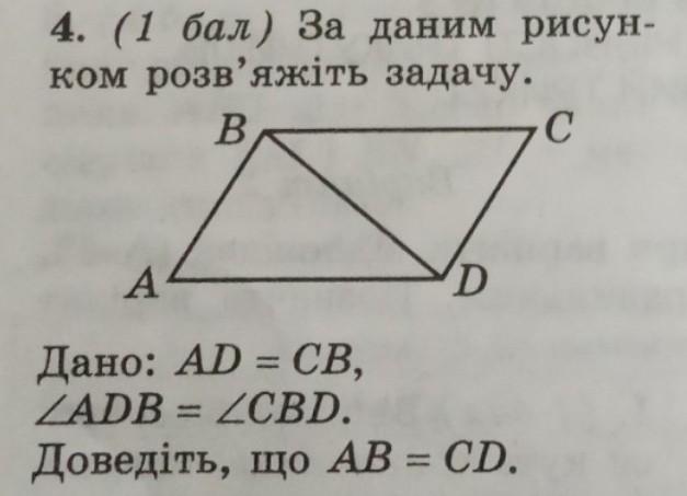 Тоді, трикутники ABD i CDB рівні. Звідси АВ = СD, як відповідні сторони у рівних трикутниках