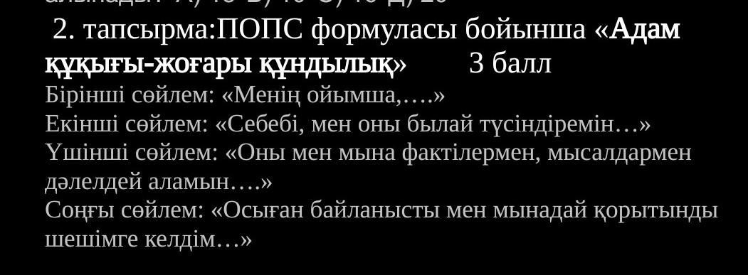 20 балов! 2. тапсырма:ПОПС формуласы бойынша «Адам құқығы-жоғары құндылық» 3 балл Бірінші сөйлем: «Менің ойымша,….» Екінші сөйлем: «Себебі, мен оны былай түсіндіремін…» Үшінші сөйлем: «Оны мен мына фактілермен, мысалдармен дәлелдей аламын….» Соңғы сөйлем: «Осыған байланысты мен мынадай қорытынды шешімге келдім…»
