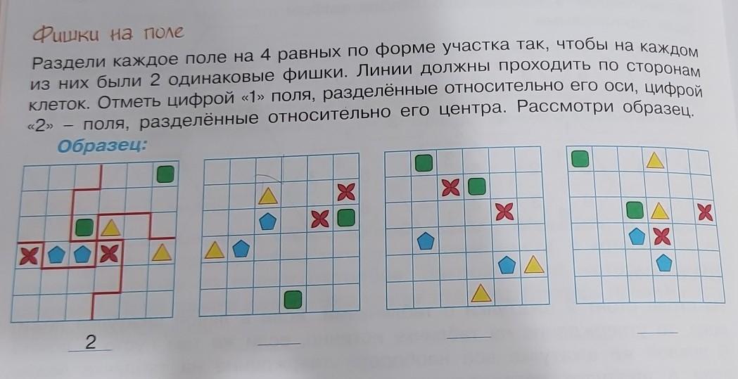 Фишки на поле Раздели каждое поле на 4 равных по форме участка так, чтобы на каждом из них были 2 одинаковые фишки. Линии должны проходить по сторонам клеток. Отметь цифрой «1» поля, разделённые относительно его оси, цифрой поля, разделённые относительно его центра. Рассмотри образец. «2»> Образец: X 2 X X ХО XO X X