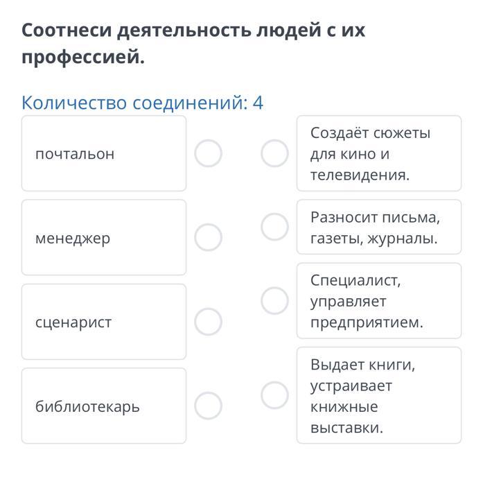 почта-2 менеджер-3 библиотекарь-4 сценарист-1
