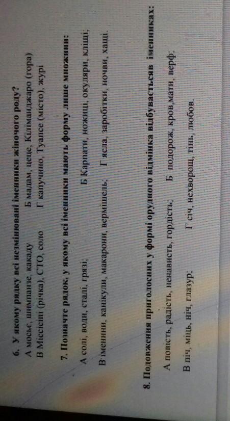 6. У якому рядку всі незмінювані іменники жіночого роду? А мосьє, шимпанзе, какаду в Міссісіпі (річка), СТО, соло Б мадам, цеце, Кіліманджаро (гора) капучино, Туапсе (місто), журi З
