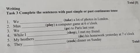 Writing Task 3 Complete the sentences with past simple or past continuous tense 1. We 2. Max 3. We 4. While I 5. My brothers 6. They (take) a lot of photos in London. (play) a computer game at 6 o'clock. (go) to Paris last year. (shop), I met my friend. (do) his homework yesterday at 7 o'clock (cook) dinner on Sunday Total ariance on пж помогите 20баллов дам