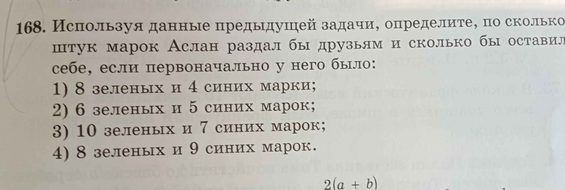 168. Используя данные предыдущей задачи, определите, по сколько штук марок Аслан раздал бы друзьям и сколько бы оставил себе, если первоначально у него было: 1) 8 зеленых и 4 синих марки; 2) 6 зеленых и 5 синих марок; 3) 10 зеленых и 7 синих марок; 4) 8 зеленых и 9 синих марок. помогите пжжжжжж даю 10 баллов!!
