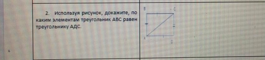 2. Используя рисунок, докажите, по каким элементам треугольник АВС равен треугольнику АДС. 2 бал