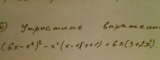 (6x-x^2)^2-x^2(x-1)(x+1)+6x(3+2x^2)=36x^2-x^4-x^2(x^2+x-x-1)+18x+12x^3= 36x^2-x^4-x^4-x^3+x^3+x^2+18x+12x^3=37x^2-2x^4+12x^3+18x = можно еще вынести х за скобки =x(37x-2x^3+12x^2+18)