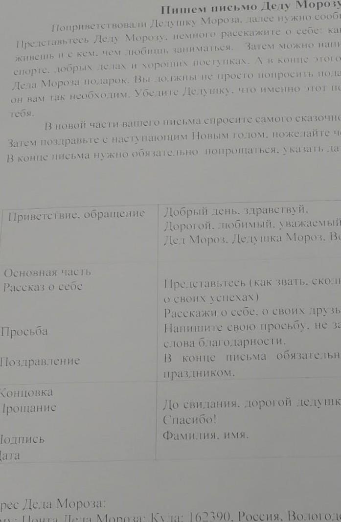 Здравствуй,дорогой дедушка мороз!Меня зовут ( твое имя), мне ( твой возраст) лет.Я хорошо учусь ,люблю играть,занимаюсь ( твой спорт ,увлечение) .У меня есть мои любимые друзья которые не бросят в беде!Мой любимый цвет ( твой любимый цвет) .На новый год я хочу ( твои желания на новый год). Если ты его исполнишь мне будет очень приятно. И кстати я поздравляю тебя с Новым годом. До свидания,дед мороз. Спасибо за праздник! От ( твоя фамилия, имя)