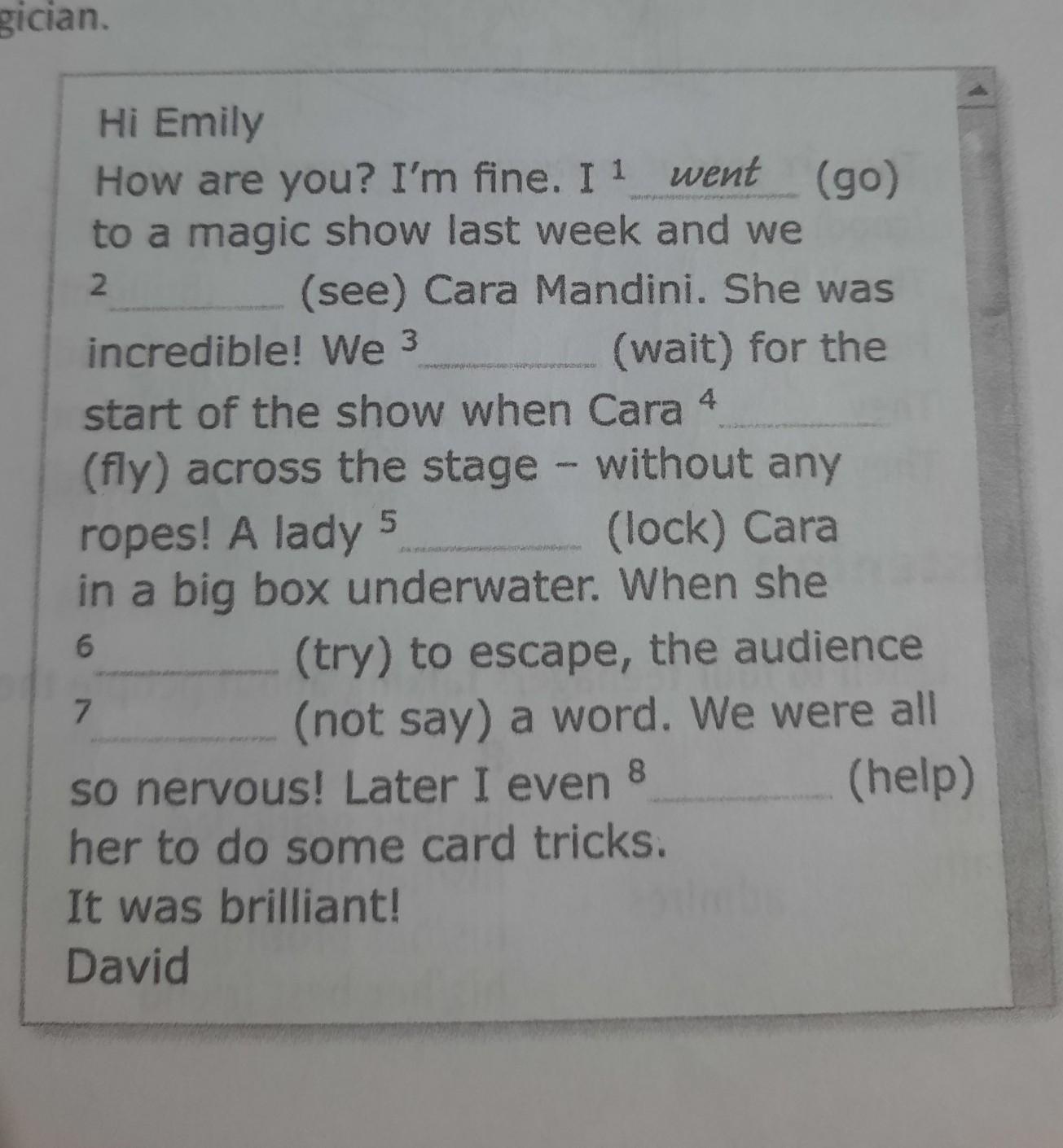2saw 3.were waiting 4.flew 5.locked 6.tried 7.didn't say a word. 8.helped