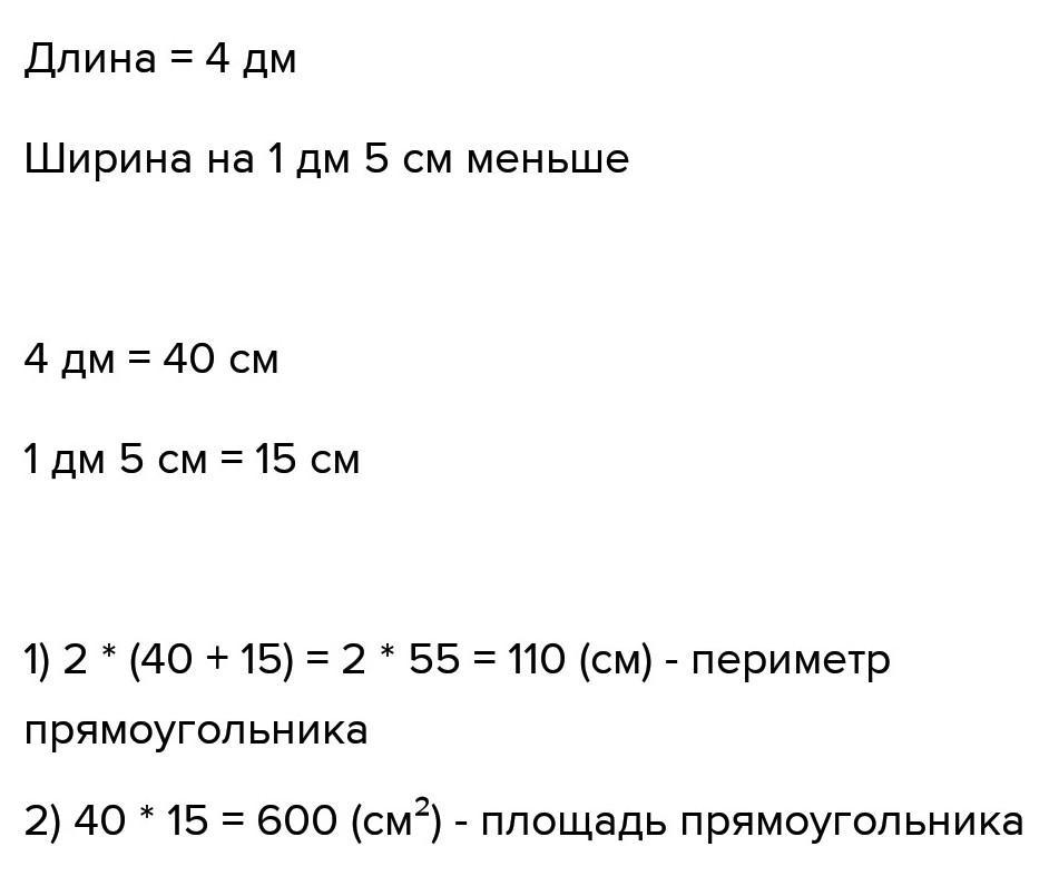 математика Дайте номер пять Длина прямоугольника 4 дм а ширина на 1 дм 5 см короче Найди периметр площадь этого прямоугольника длины стороны выразил в сантиметрах