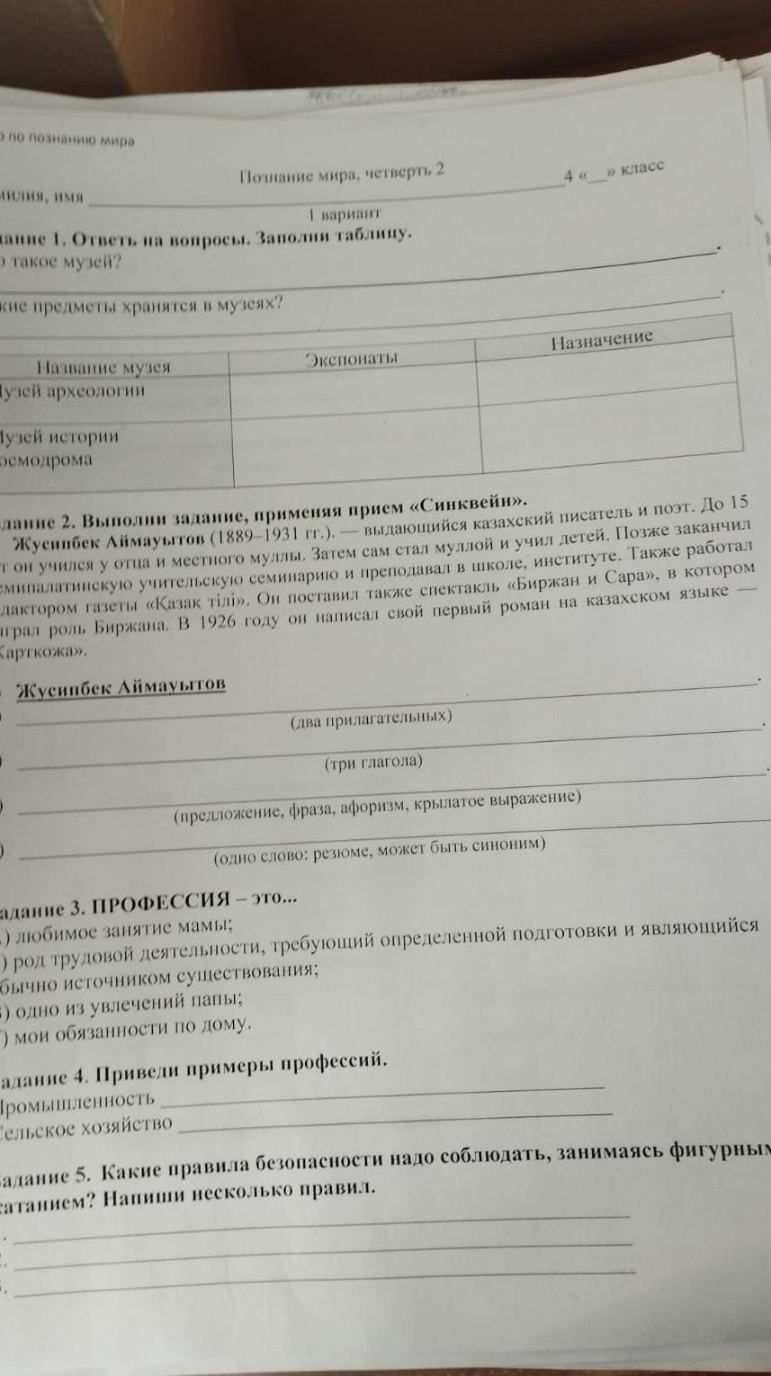1. 21 Познание мира, четверть 2 Фамилия, имя 1 вариант Задание 1. Ответь на вопросы. Заполни таблицу. Что такое музей? Какие предметы хранятся в музеях? 3: Название музея Музей археологии Музей истории космодрома Экспонаты 1) Жусипбек Аймауытов 2) выдающийся, кopeakkuur (два прилагательных) 3) умился, преподавал работал (три глагола) Задание 2. Выполни задание, применяя прием «Синквейн». Жусипбек Аймауытов (1889-1931 гг.). выдающийся казахский писатель и поэт. До 15 лет он учился у отца и местного муллы. Затем сам стал муллой и учил детей. Позже заканчил Семипалатинскую учительскую семинарию и преподавал в школе, институте. Также работал редактором газеты «Қазақ тілі». Он поставил также спектакль «Биржан и Са сыграл роль Биржана. В 1926 году он написал свой первый роман на казахском языке «Карткожа>>... в котором 4) бул Питатель 5), тиск учис Задание 3. ПРОФЕССИЯ - это... Поэзия музыка души (предложение, фраза, афоризм, крылатое выражение) (одно слово: резюме, может быть синоним) >> класс Назначение В) одно из увлечений папы; Г) мои обязанности по дому. А) лобимое занятие мамы; и роль Б)род трудовой деятельности, требующий определенной подготовки и являющийся обычно источником существования; Задание 4. Приведи примеры профессий. Промышленность Сельское хозяйство Задание 5. Какие правила безопасности надо соблюдать, занимаясь фигурным катанием? Напиши несколько правил.