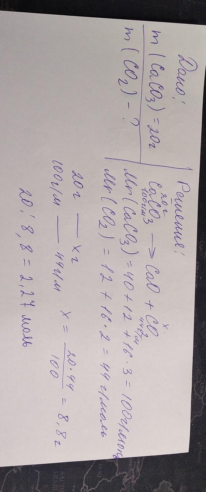 1. Какое количество вещества углекислого газа выделится в результате разложения 20 г СaCO3? CaCO3 → CaO + CO2
