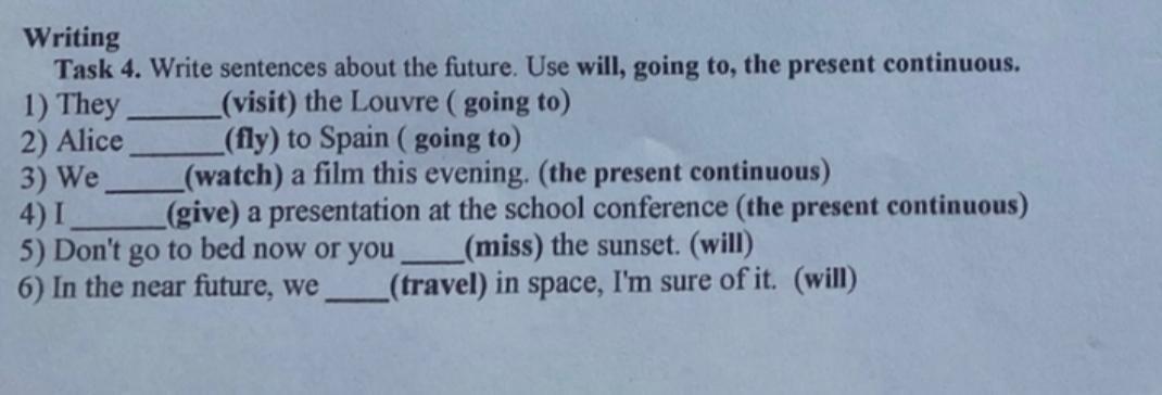 1. visiting 2. flying.3. are watching. 4. am giving.5. will miss. 6.will travel